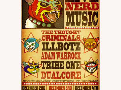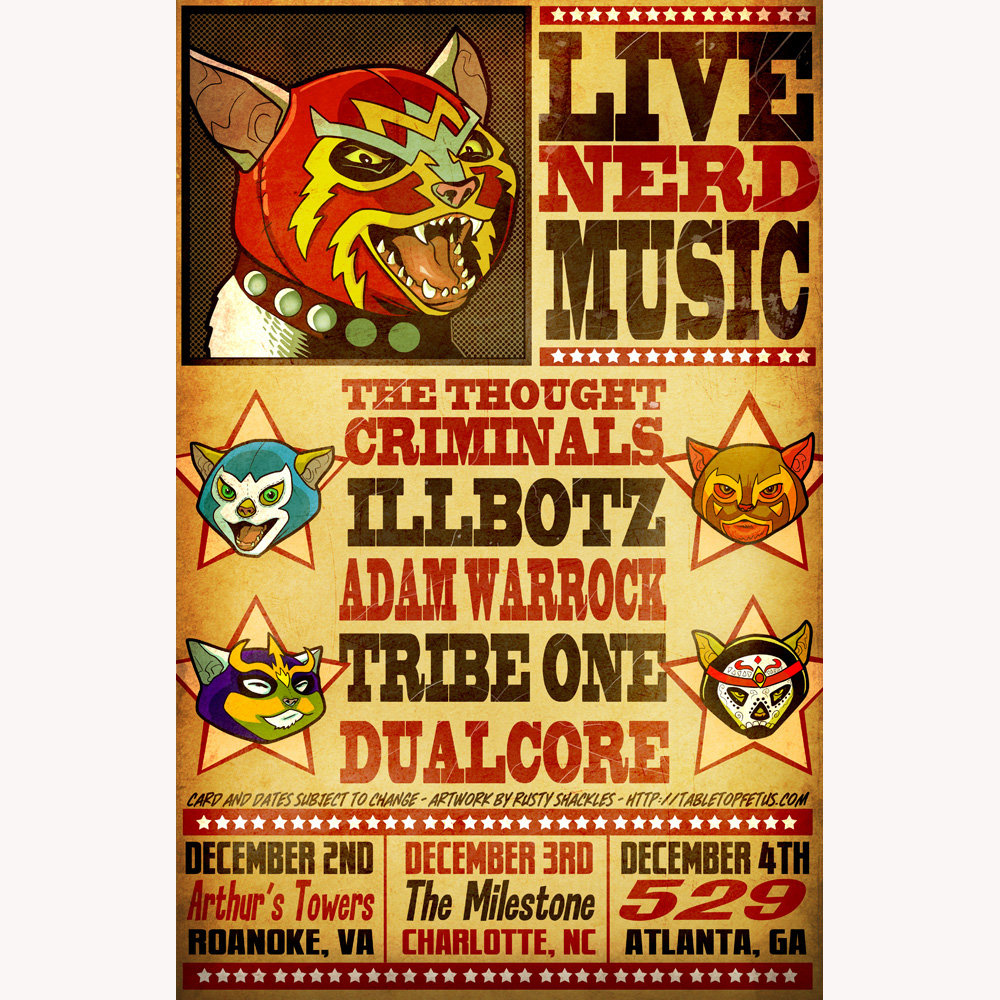 A high quality art print of Rusty Shackles incredible gig poster for our minitour with Adam WarRock, Dual Core, Tribe One & Illbotz. Shipped in a tube to ensure that it is never folded. Ships separate from other items. Orders of multiple posters will be shipped in the same tube. Thanks!